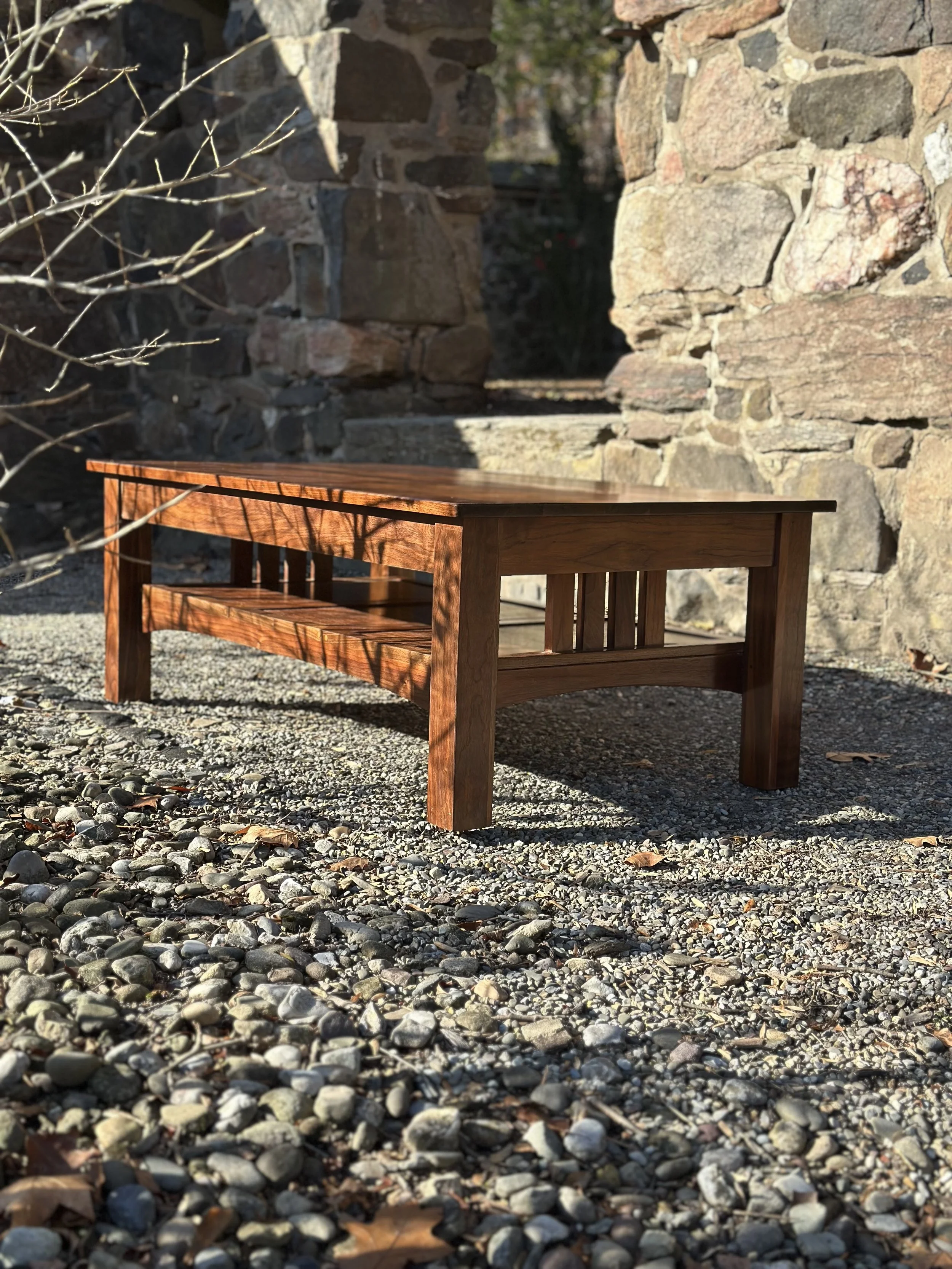 [Walnut “mission style” coffee table made from a china cupboard top not used by the family which blended into their look and feel.]